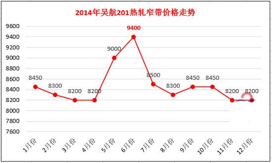 在国内所有生产水蜜桃视频在线观看热轧窄带的民营钢厂当中,主要的钢种是201。以吴航201热轧高铜料为例,价格在6月份达到了全年的顶峰,为 9400元/吨。随后出现下滑,后停留在8200元/吨,为2014年画上了句号。其中,2014年吴航201热轧窄带价格走势如下图所示: