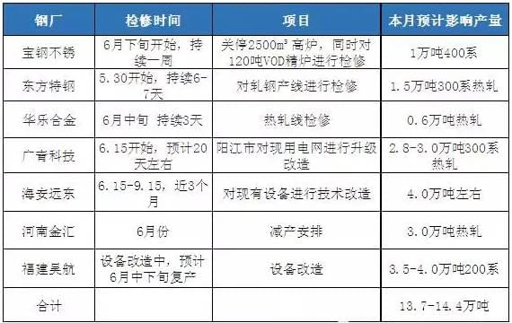 6月份钢厂检修情况汇总