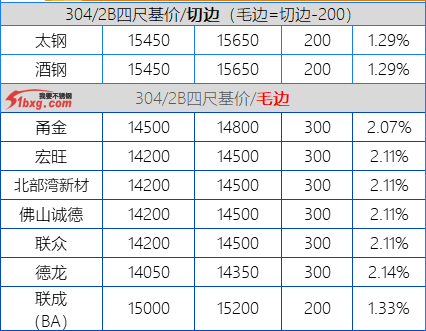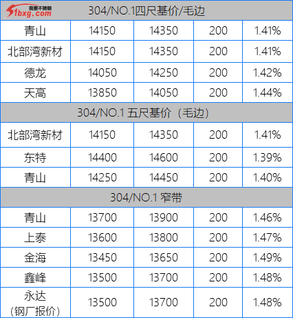 午后,现货依然在执行涨涨涨的模式,成交也是各种乱价中,电议成为主题,市场主流报价: 福建甬金四尺14700-15050元/吨; 广东甬金五尺14900-15800元/吨;宏旺、 北部湾、诚德等14650-14900毛基;德龙含税14400-14650元/吨基。